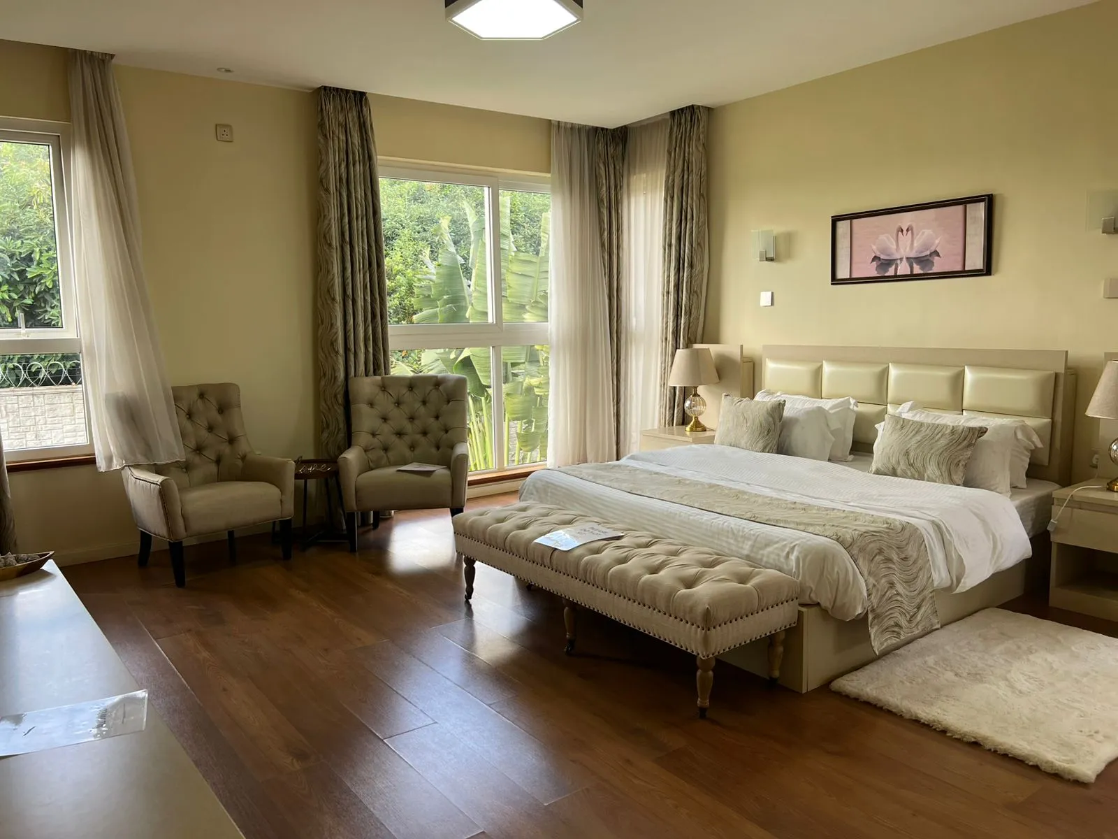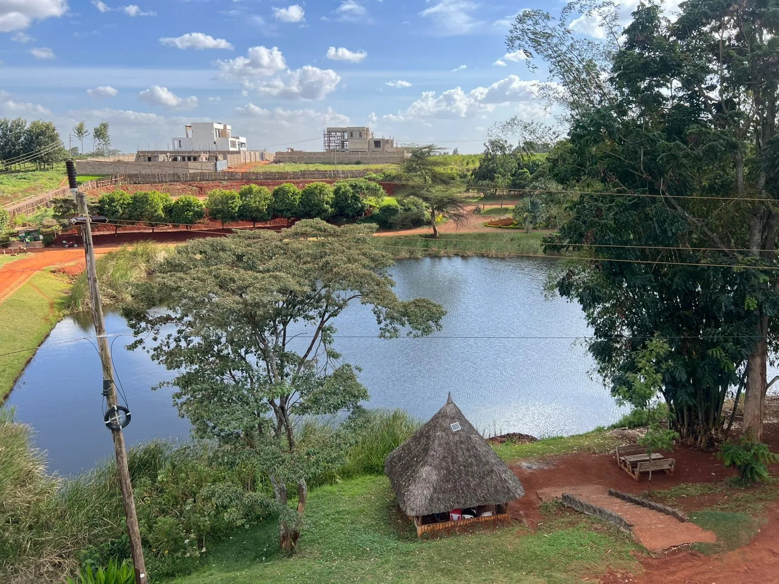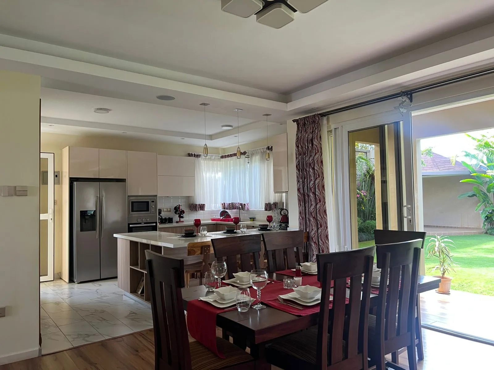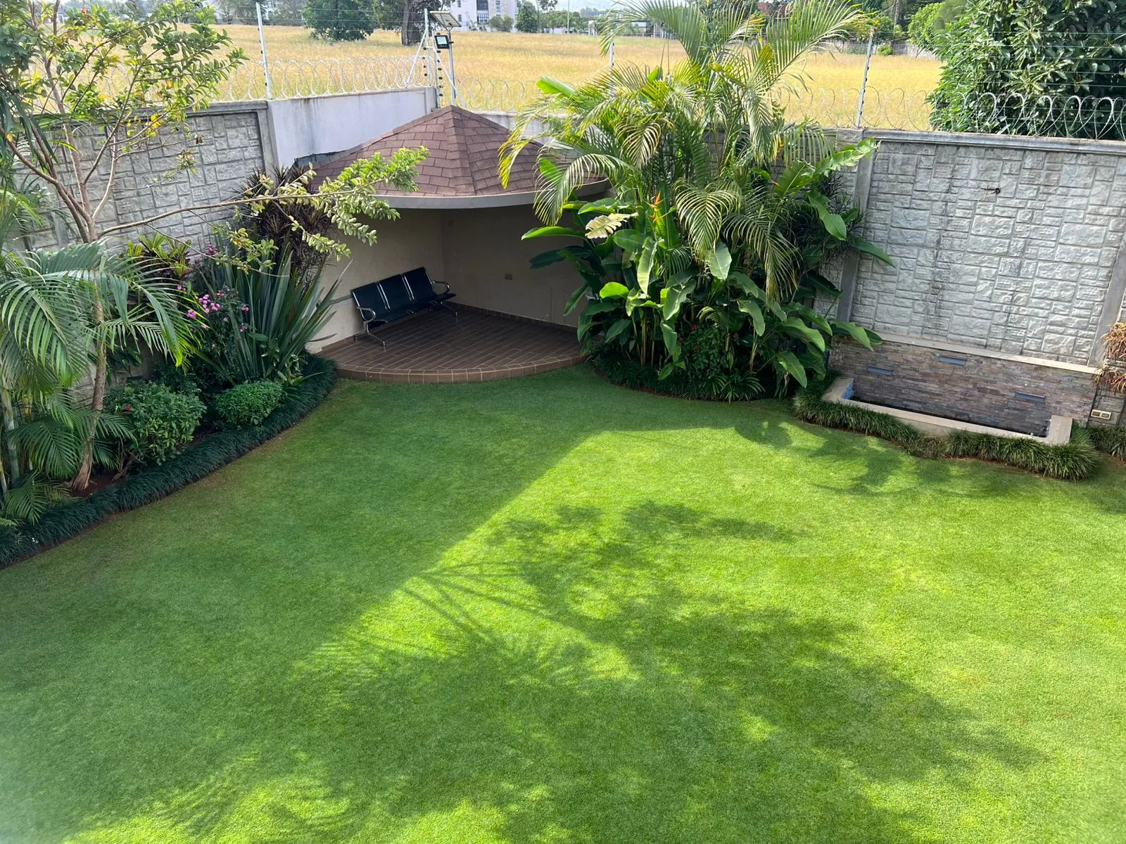 4 bedroom spacious townhouse for sale in Runda, featuring a spacious study room on the last floor. All bedrooms are ensuite, with a cloakroom on the lower floor. The house includes a well-equipped kitchen and modern bathrooms. The upper floor hosts a family room and a balcony. Additional features include a well-manicured garden, solar, and a carport. The property offers a beautiful view of a lake from the house.