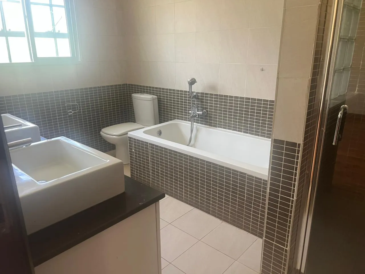 5 bedroom all en-suite townhouse in a secure gated community. It features a well-finished interior with a spacious, huge living area and a fireplace. There is a cloakroom and a balcony in one of the bedrooms on the upper level. The master bedroom includes a calling closet. The house boasts a modern kitchen and well-finished bathrooms. Additional amenities include a carport, genset, solar, and a DSQ for two. Residents also have access to a state-of-the-art clubhouse. Negotiable.